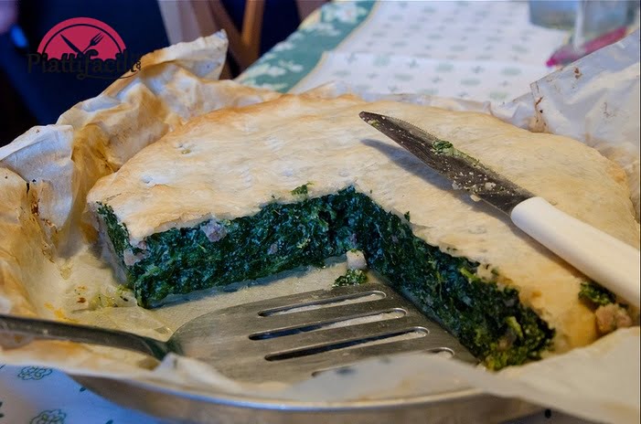 Distribuire il composto di spinaci e uova sul fondo della pasta. Pareggiare la superficie con una forchetta e rigirare verso il centro la pasta che avanza. Infornare per circa 20 minuti o fino a quando la superficie si colora.